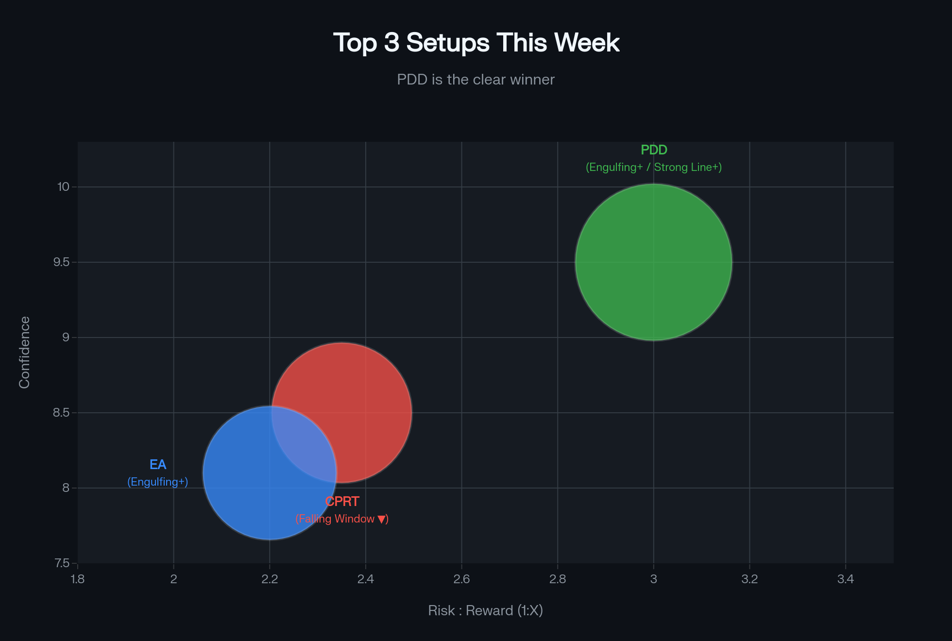 This week's focus: PDD Holdings as the highest-conviction setup — the only stock in Friday's scan with two simultaneous bullish signals AND 78% above-average volume confirming institutional buying. Entry, stop, and targets in Premium.