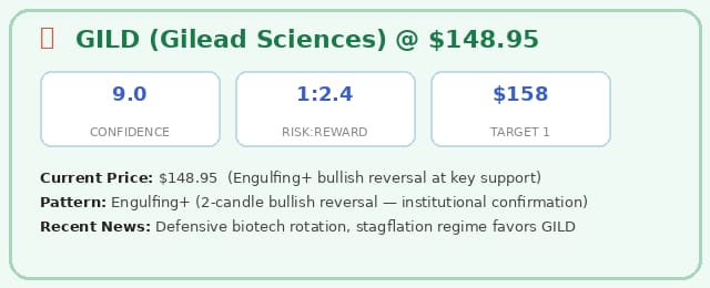 📊 QUICK TAKE: The market is rotating OUT of high-multiple software (MSFT Falling Window, WDAY distribution, ZS bearish continuation) and INTO defensive biotech and energy. Gilead Sciences printed an Engulfing+ bullish reversal at key $148 support on Friday Feb 27 — the highest-reliability 2-candle reversal pattern. With VIX at 18.63 and tariff-driven stagflation risk rising, defensives are the institutional play this week. GILD is the "hidden rotation trade" — everyone is watching NVDA while institutions quietly load defensives.