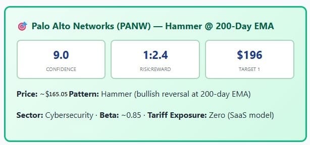 The cybersecurity thesis is unchanged. PANW has pulled back into its 200-day EMA — precisely where institutional buyers historically step in. The Hammer candle signals rejection of lower prices with a long lower wick. This is a high-R:R setup in a sector with zero tariff exposure and growing government spend on cyber (especially elevated post-Iran conflict escalation).