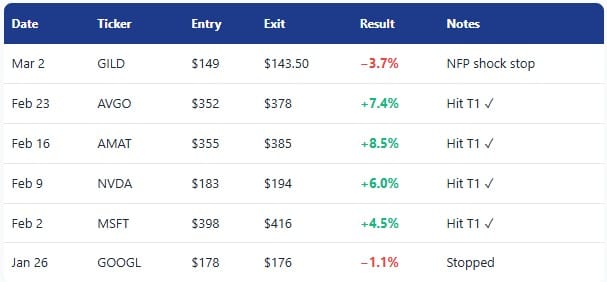 Note on GILD: The Engulfing+ pattern was valid. The thesis was correct (defensives). The −92K NFP was a 2-standard-deviation shock. Stops existed for exactly this reason. Capital preserved = ready to trade again.